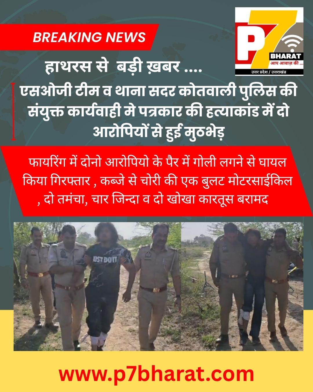 हाथरस। 07.04.2026 को वादिया श्रीमती नीतू शर्मा पत्नी मुकेश कुमार शर्मा निवासी जीवनी मण्डी थाना छत्ता कमिश्नरेट आगरा जनपद आगरा द्वारा लिखित तहरीर के माध्यम से थाना हाथरस गेट पर सूचना दी कि अभियुक्तगण द्वारा उसके भाई वेदप्रकाश शर्मा उर्फ सोनू पुत्र स्व0 रामप्रकाश शर्मा निवासी गली जै राधे दिल्ली वाला मौहल्ला थाना कोतवाली नगर का उसका मकान हडपने की नियत से दिनांक 06.04.2026 की रात्रि में हत्या कर दी है । उक्त सूचना के आधार पर थाना सहपऊ पर सुसंगत धाराओं मे अभियोग पंजीकृत किया गया । पुलिस अधीक्षक द्वारा उक्त घटना को गंभीरता से लेते हुए तत्काल मौके पर पहुंचकर घटनास्थल का निरीक्षण किया गया तथा अभियुक्तों की गिरफ्तारी हेतु अपर पुलिस अधीक्षक हाथरस के निर्देशन एवं क्षेत्राधिकारी नगर के नेतृत्व में एसओजी, सर्विलांस व थाना पुलिस सहित पांच टीमों का गठन किया गया था । विवेचना के क्रम में टीमों द्वारा साक्ष्य संकलन की कार्यवाही की गयी है तथा नामजद अभियुक्तों की गिरफ्तारी हेतु संभावित स्थानों पर दबिश दी गई। जिसके क्रम मे थाना सहपऊ पुलिस त्वरित कार्यवाही करते हुए दिनांक 09.04.2026 को अभियोग मे प्रकाश मे आये मे अभियुक्त शुभम उर्फ माइटी पुत्र राजकुमार गुप्ता निवासी दिल्ली बाला चौक थाना कोतवाली नगर को गिरफ्तार कर जेल भेजा जा चुका है तथा अन्य अभियुक्तों की गिरफ्तारी हेतु गठित टीमो द्वारा लगातार सम्भावित स्थानो पर दबिश दी जा रही थी। पुलिस अधीक्षक द्वारा अभियोग में नामजद आरोपियो की शीघ्र गिरफ्तारी हेतु दिनांक को 08.04.2026 को पुलिस अधीक्षक हाथरस द्वारा 25,000/- रुपये का इनाम घोषित किया गया था । जिसके क्रम में आज दिनांक-10.04.2026 को थाना कोतवाली हाथरस पुलिस को सूचना प्राप्त हुई कि दिनाक 07.04.2026 को यूट्यूबर वेदप्रकाश शर्मा की हत्या की घटना कारित करने वाले प्रकाश मे आये दो आरोपी अलीगढ से सासनी आ रहे है । जिसके क्रम में एक टीम थाना सासनी बार्डर तथा एक टीम वनचेतना व एक टीम शक्ति वन के सामने चैकिंग कर रहे थे । तभी शक्ति वन के पास चैकिंग कर रही पुलिस टीम को सूचना मिली कि दोनो आरोपी हनुमान चौकी से निकलते हुये आ रहे है। जिनको पुलिस द्वारा रुकने का इशारा किया तो बदमाशो ने पुलिस को देखकर मोटरसाइकिल शक्ति वन की तरफ भगा ली, बदमाशों ने अपने आप को घिरता देख पुलिस पर जान से मारने की नियति से फायरिंग शुरू कर दी, पुलिस द्वारा भी आत्मरक्षार्थ अपने बचाव में फायरिंग की गयी । जिसके क्रम मे गठित पुलिस टीमो के अथक प्रयासोपरान्त आज दिनांक 10.04.2026 को एसओजी टीम व थाना कोतवाली नगर पुलिस की संयुक्त कार्यवाही मे पुलिस मुठभेड के दौरान पुलिस टीम द्वारा आत्मरक्षार्थ की गयी जवाबी फायरिंग में अभियुक्त दो आरोपी रुद्द पाठक व वंश दीक्षित उपरोक्त के पैर में गोली 