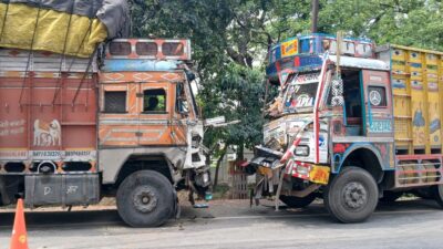 हनुमान चौकी के सामने दो ट्रकों आमने-सामने से भिडे